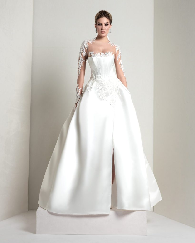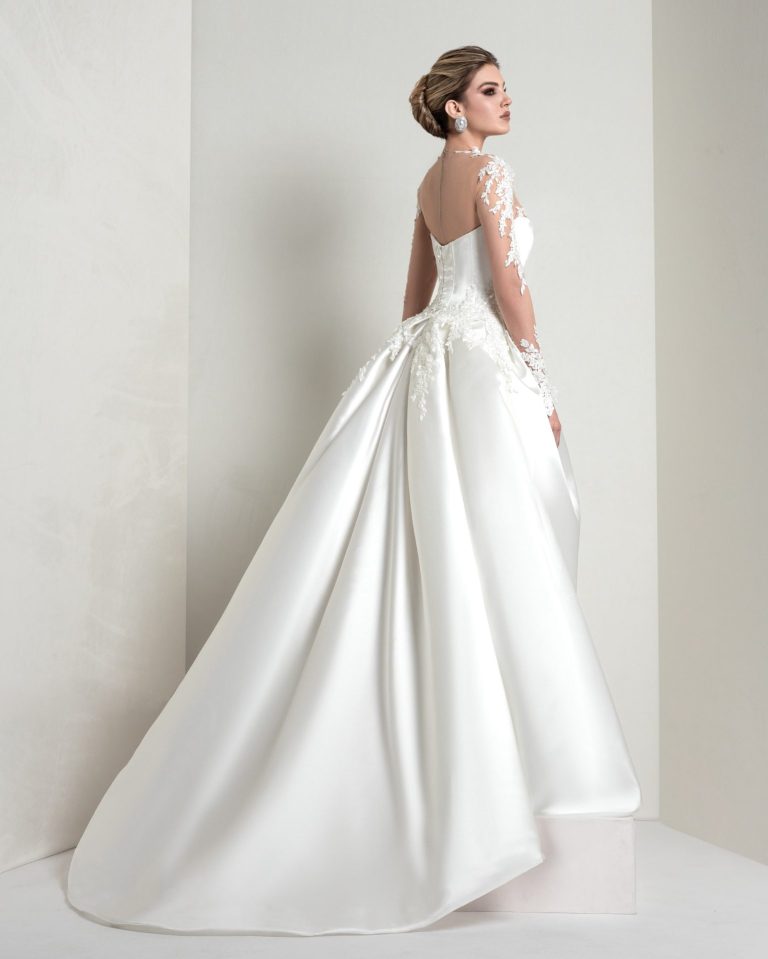 A mikado dress with illusion tulle inserts, adorned with sparkling leaf motifs. The contrast between sheer panels and structured volumes creates a glamorous effect—perfect for brides seeking a distinctive, technically refined dress.