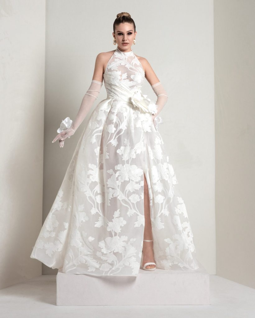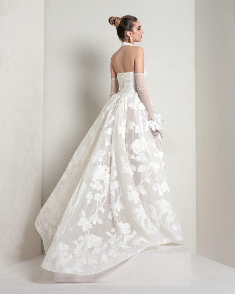 A-line dress with halter neckline. Crafted from cotton jacquard over a tulle base, it blends structured elegance with airy lightness—perfect for a bride with a refined, understated style.
