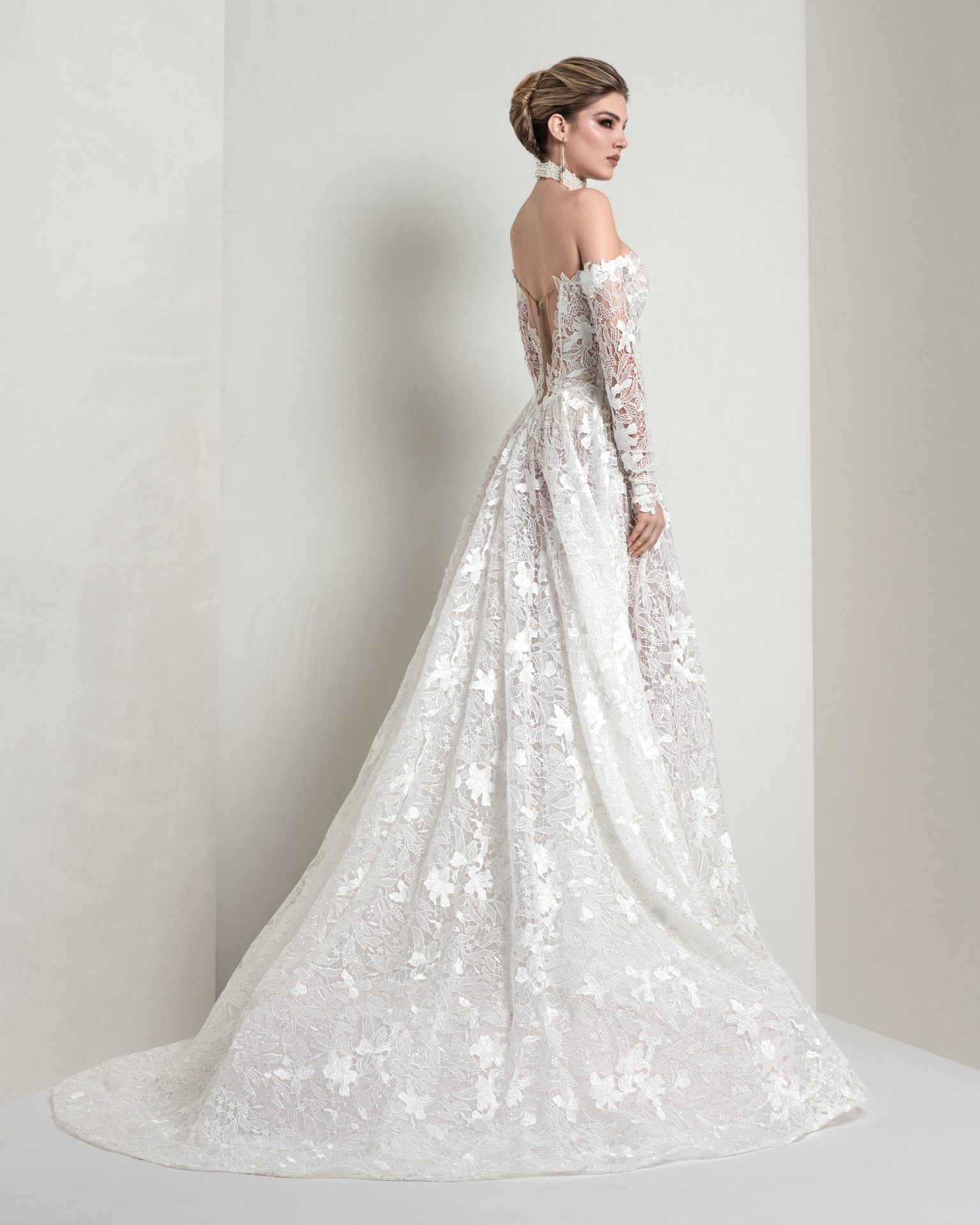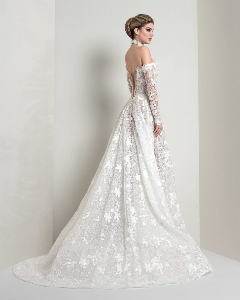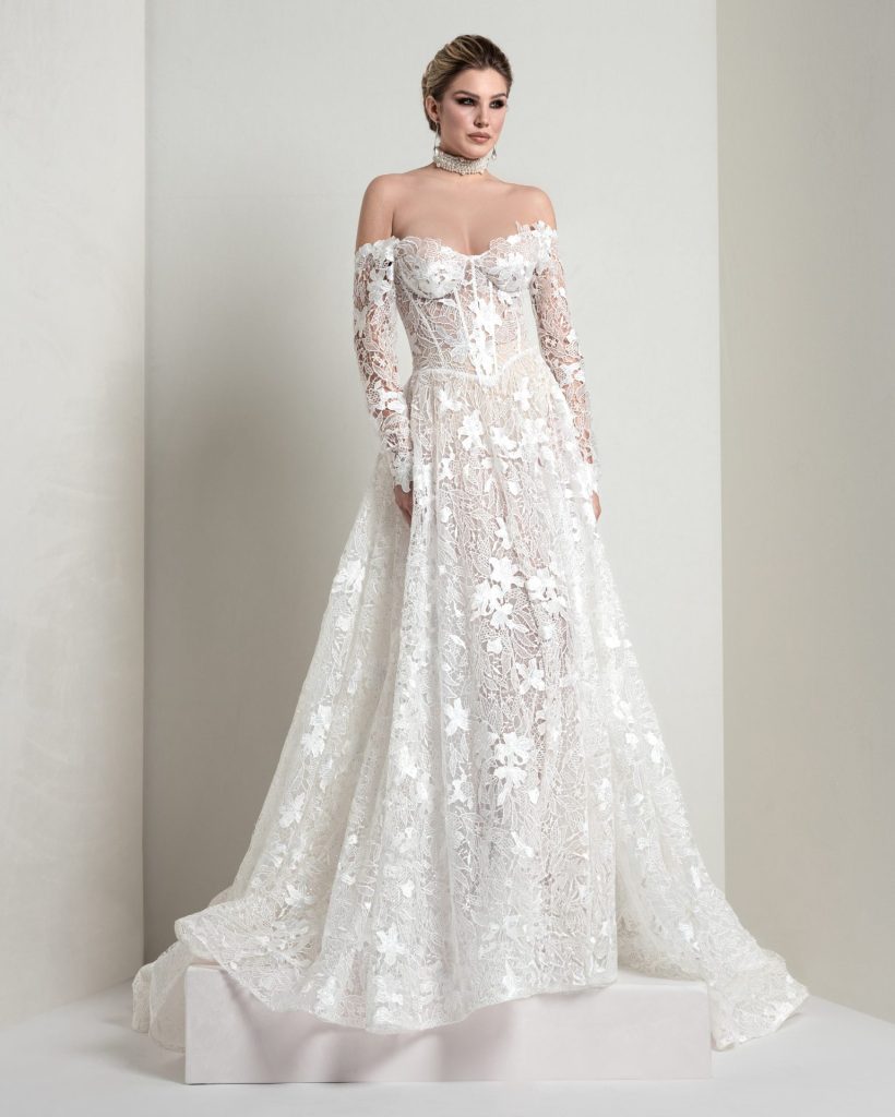 The trapeze silhouette in macramé net is hand‑embroidered with beads and sparkling accents. A plunging neckline and off‑the‑shoulder sleeves define this striking gown—perfect for brides seeking refined, contemporary elegance.