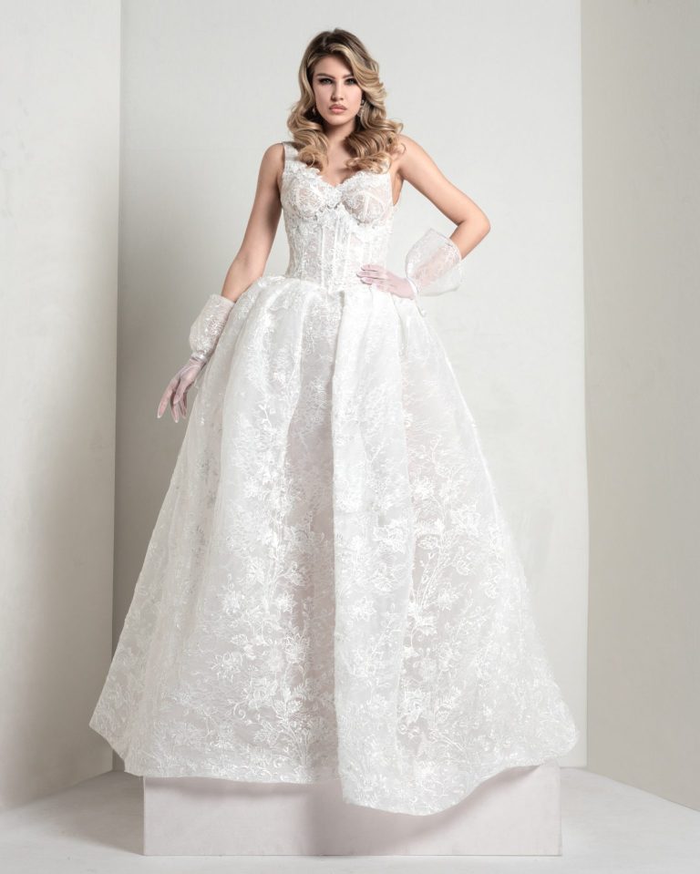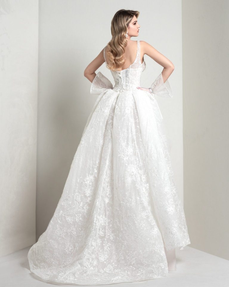 A dual dress that comes from a long tube with chantilly slit, to which is superimposed a super bustier, with 3D embroidered macrame folds. Elegance is in the combination of lightness and material quality.