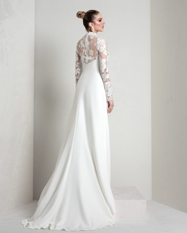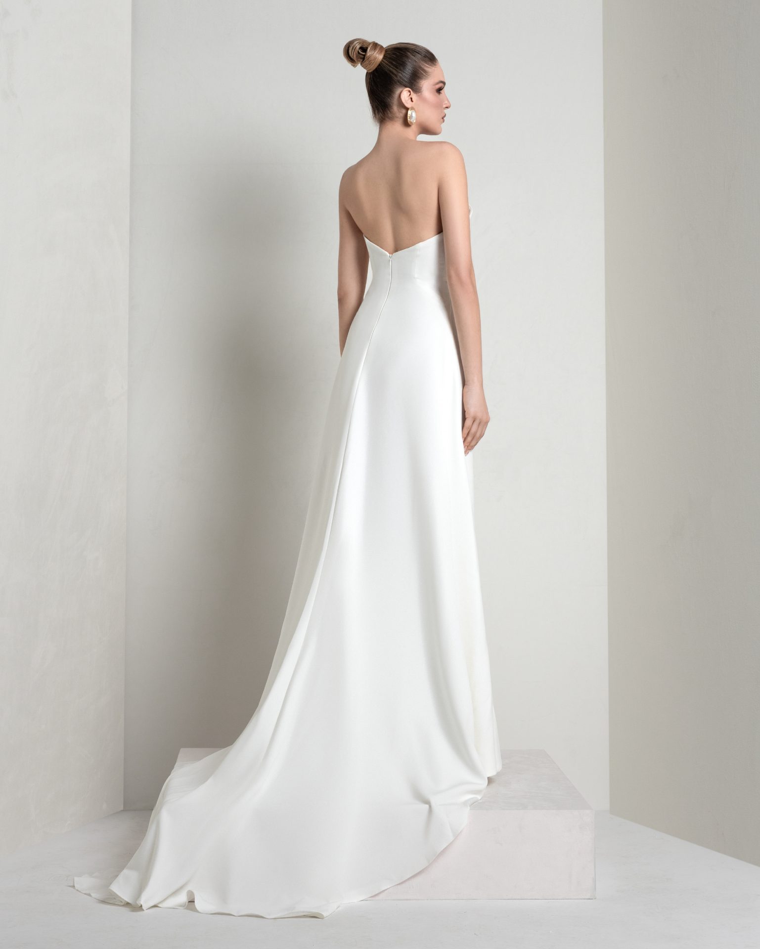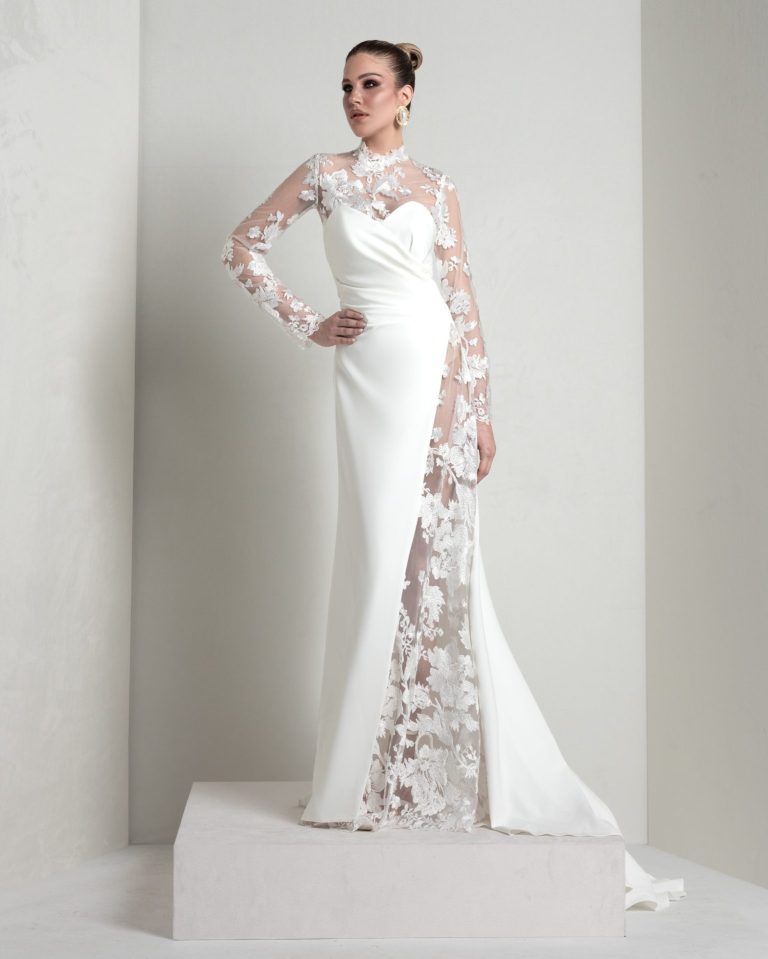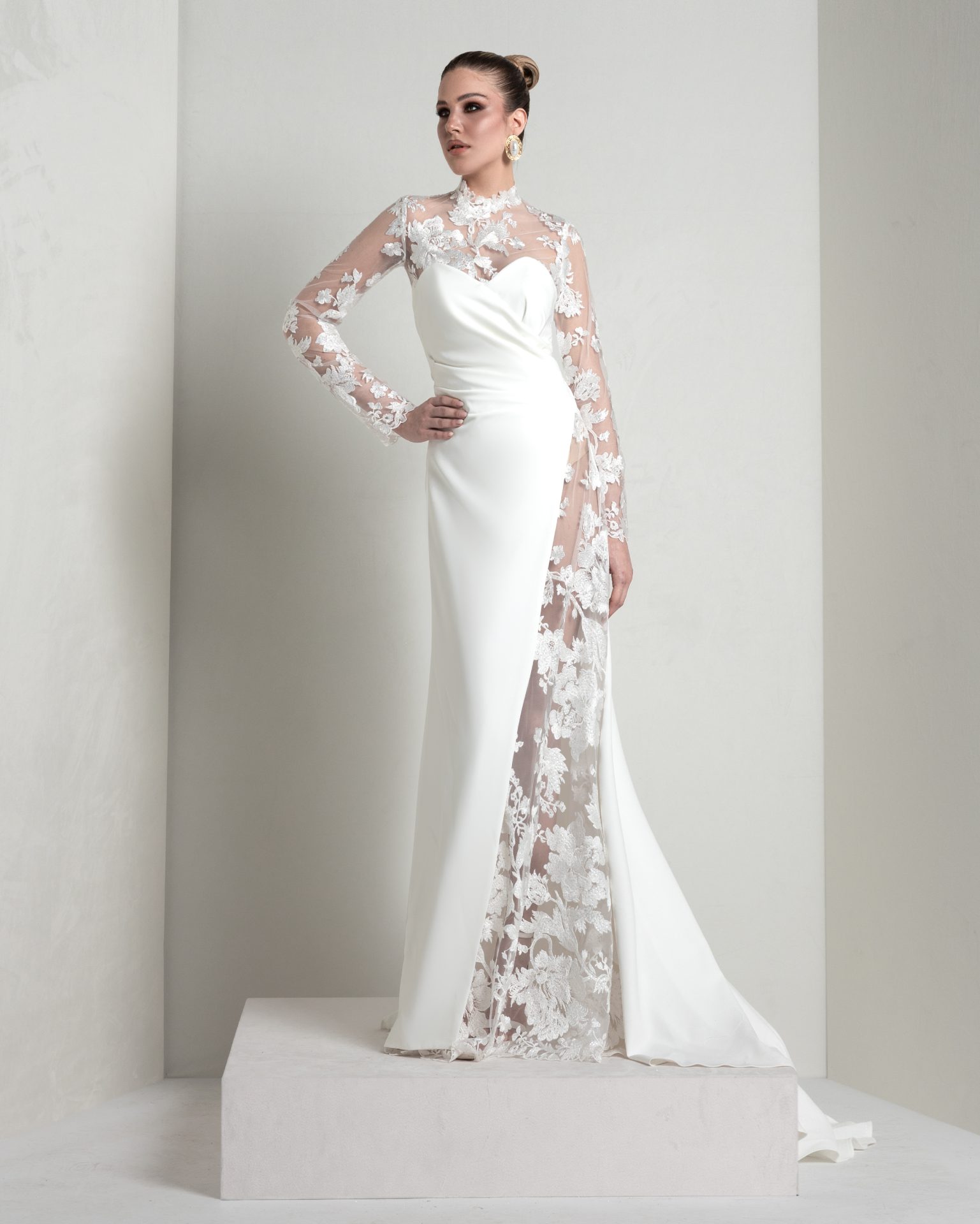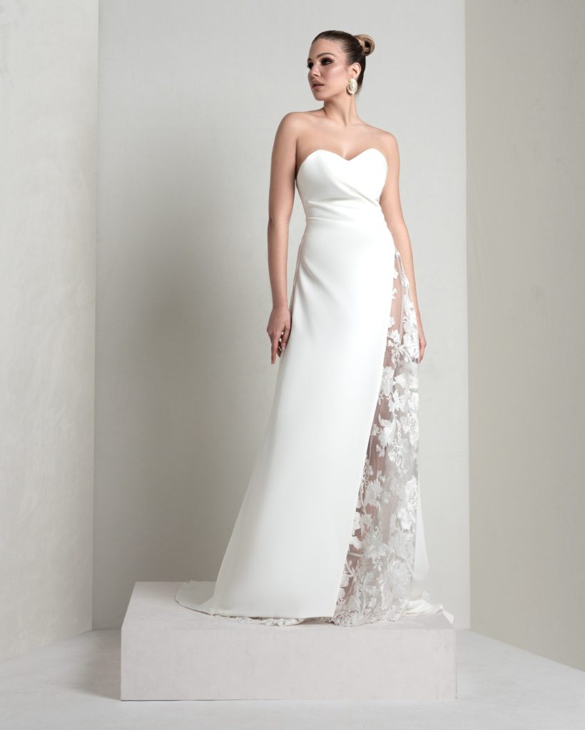 Crêpe A-line with deep slit filled with macramé. The matching bodysuit is ideal for a refined and versatile effect.