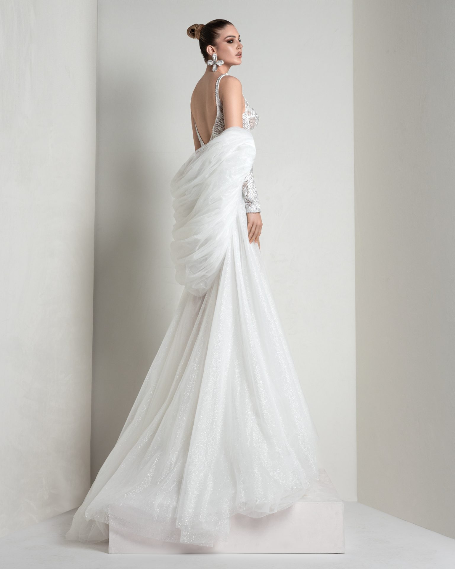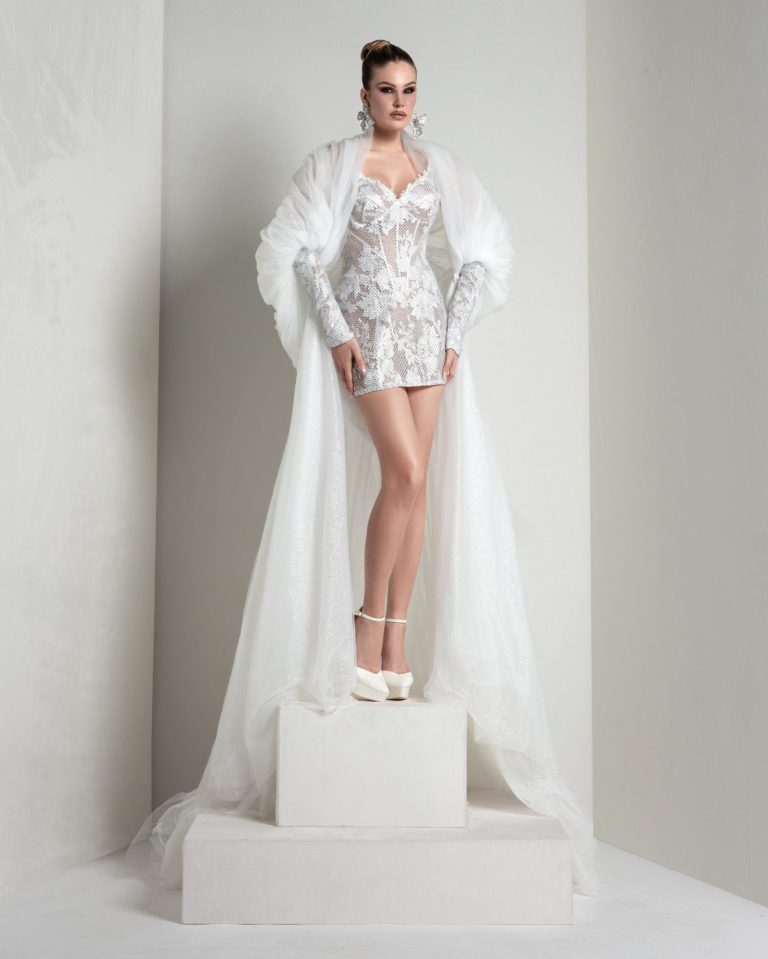 A mini dress in Swarovski mesh and romantic lace—a modern, iconic contrast. It can be elevated with a glitter tulle and organza hooded cape, evoking an ancient-inspired mood.