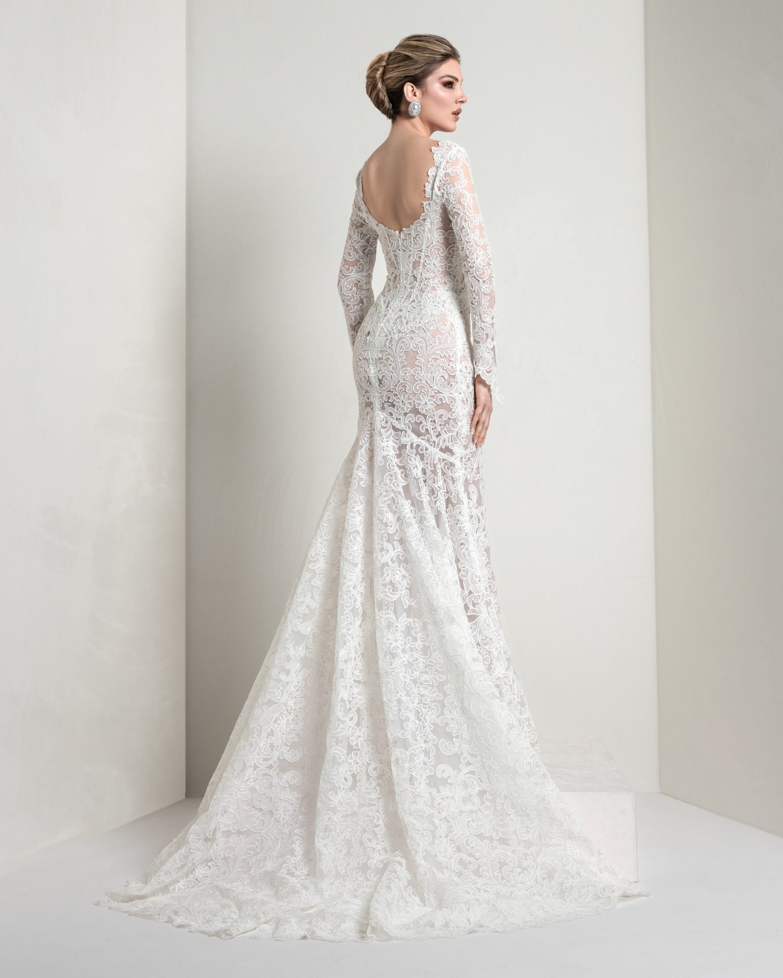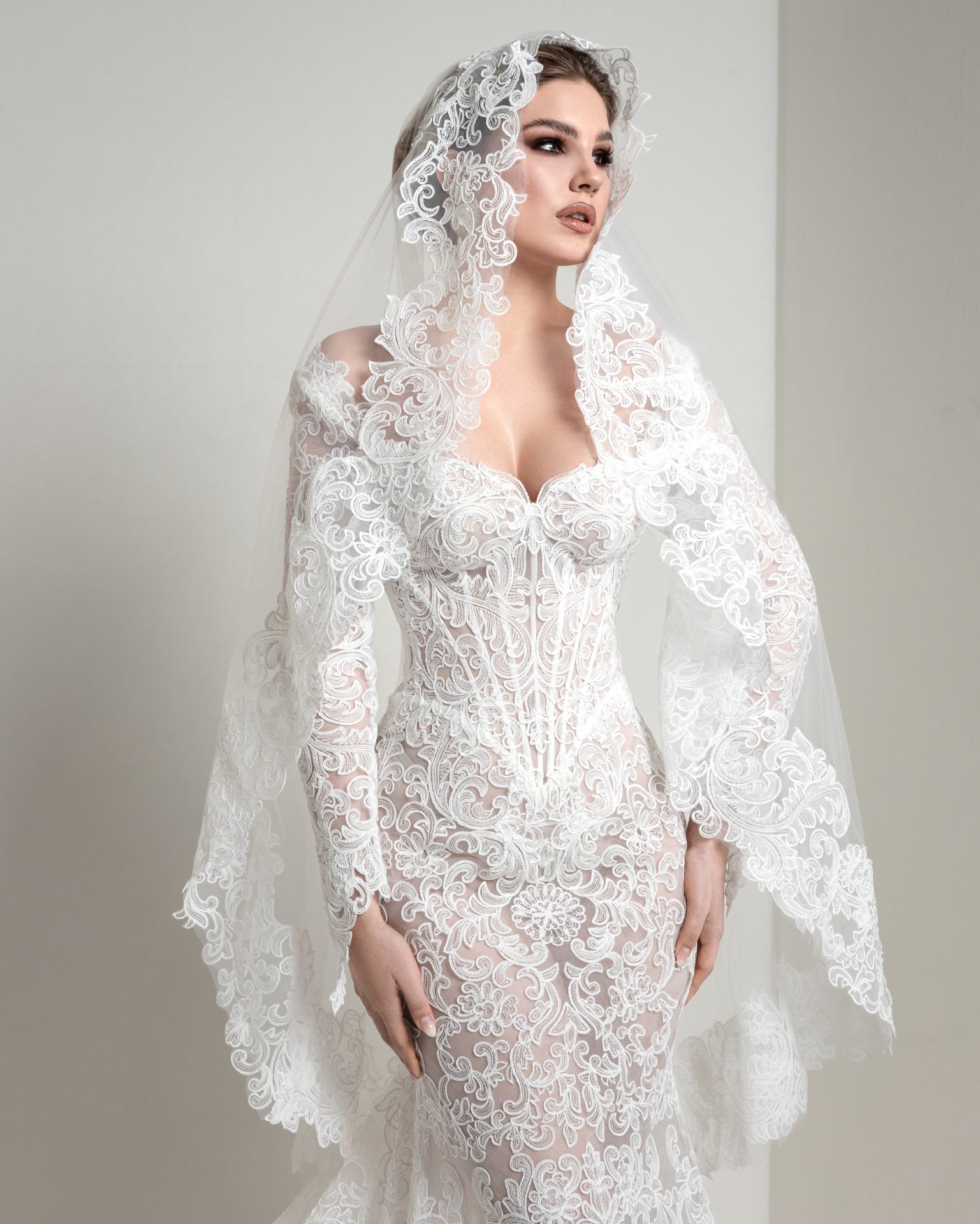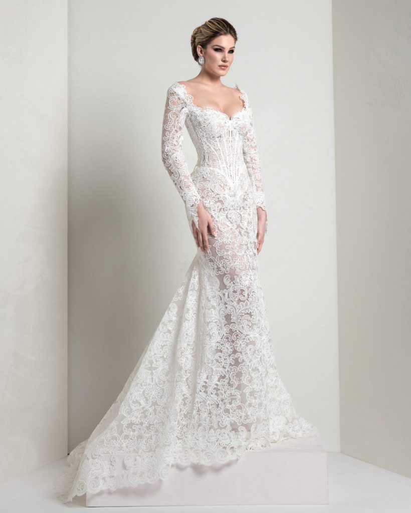 Mermaid silhouette in macramé lace over a glitter base, featuring an all‑over Baroque pattern. The symmetrically cut neckline is embellished with ornate Baroque motifs. Paired with a mantilla veil, it accentuates the artisanal craftsmanship and luxurious beauty of Italian lace.