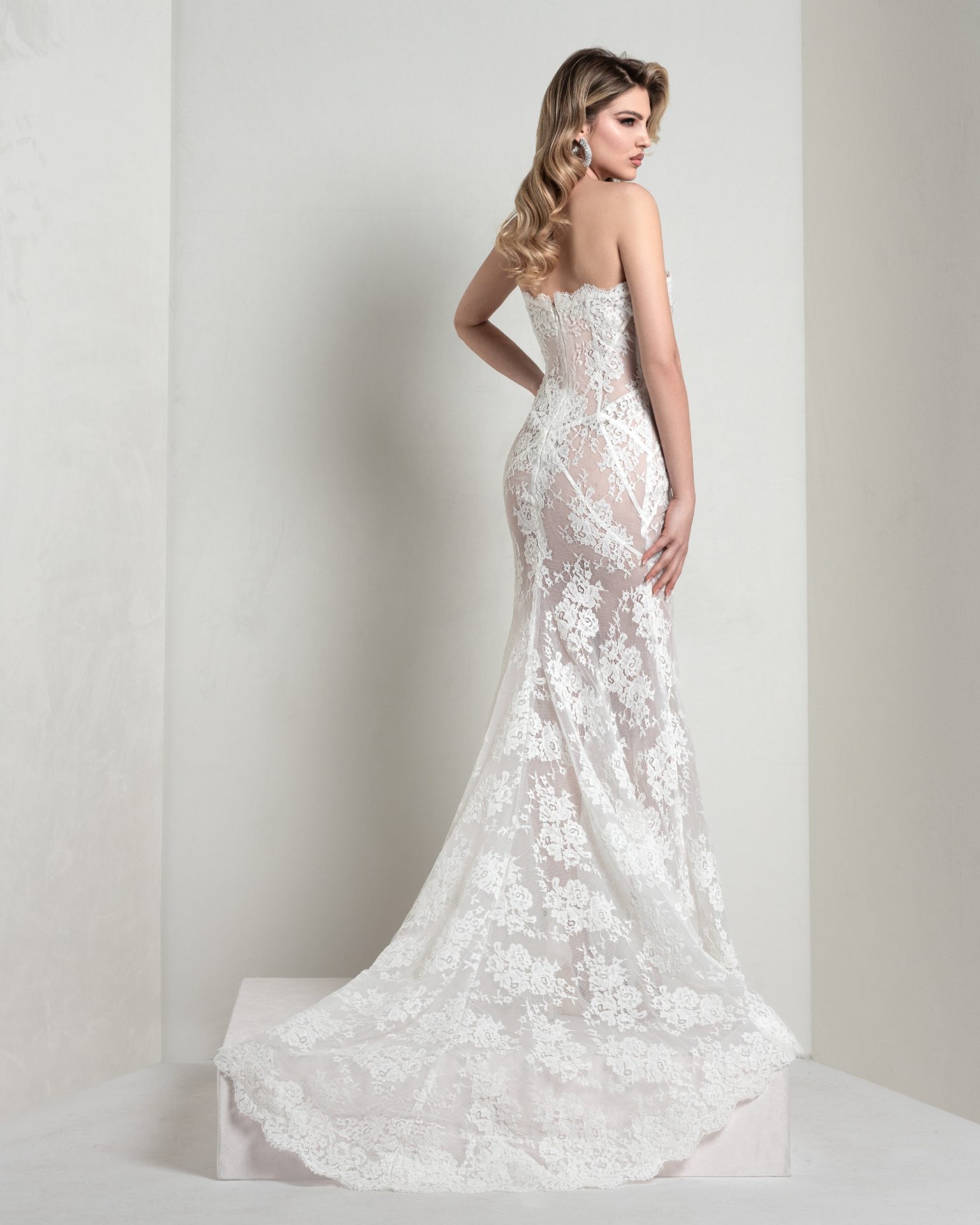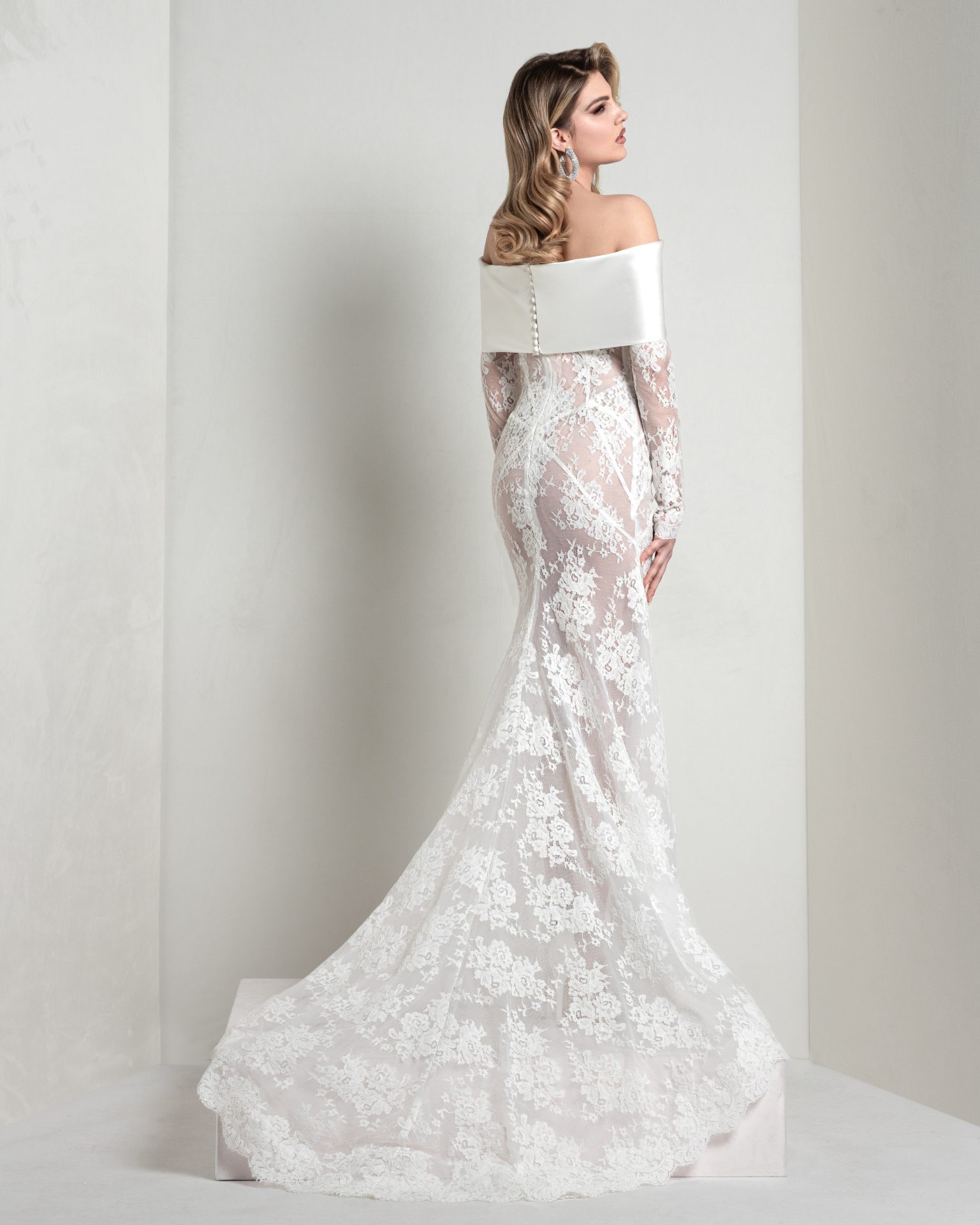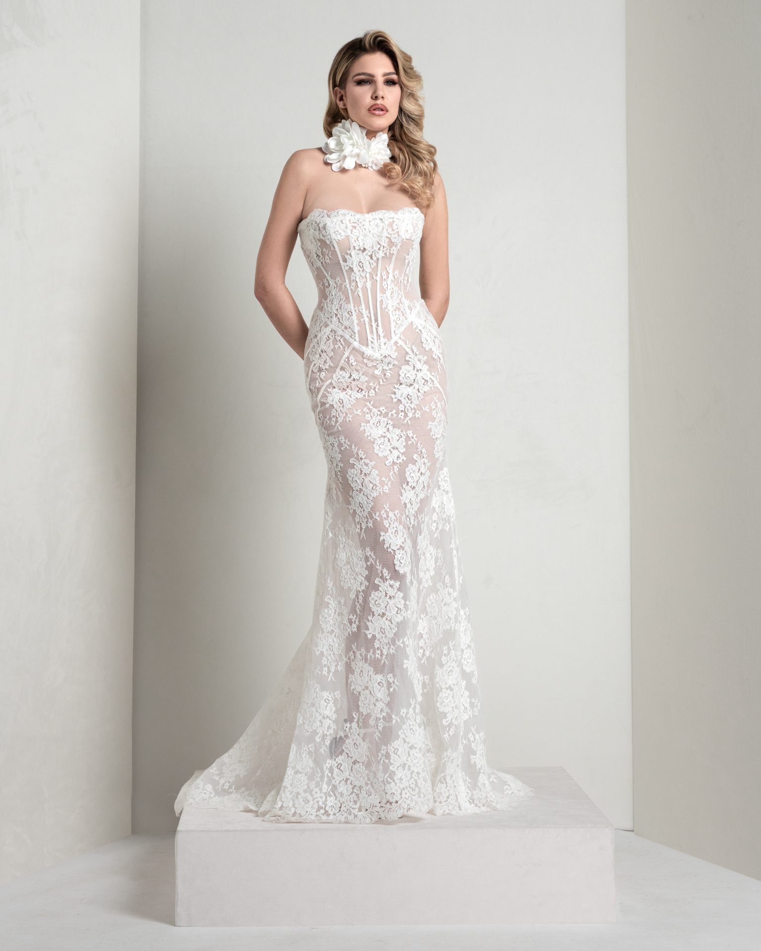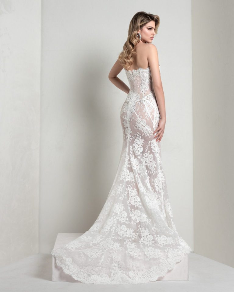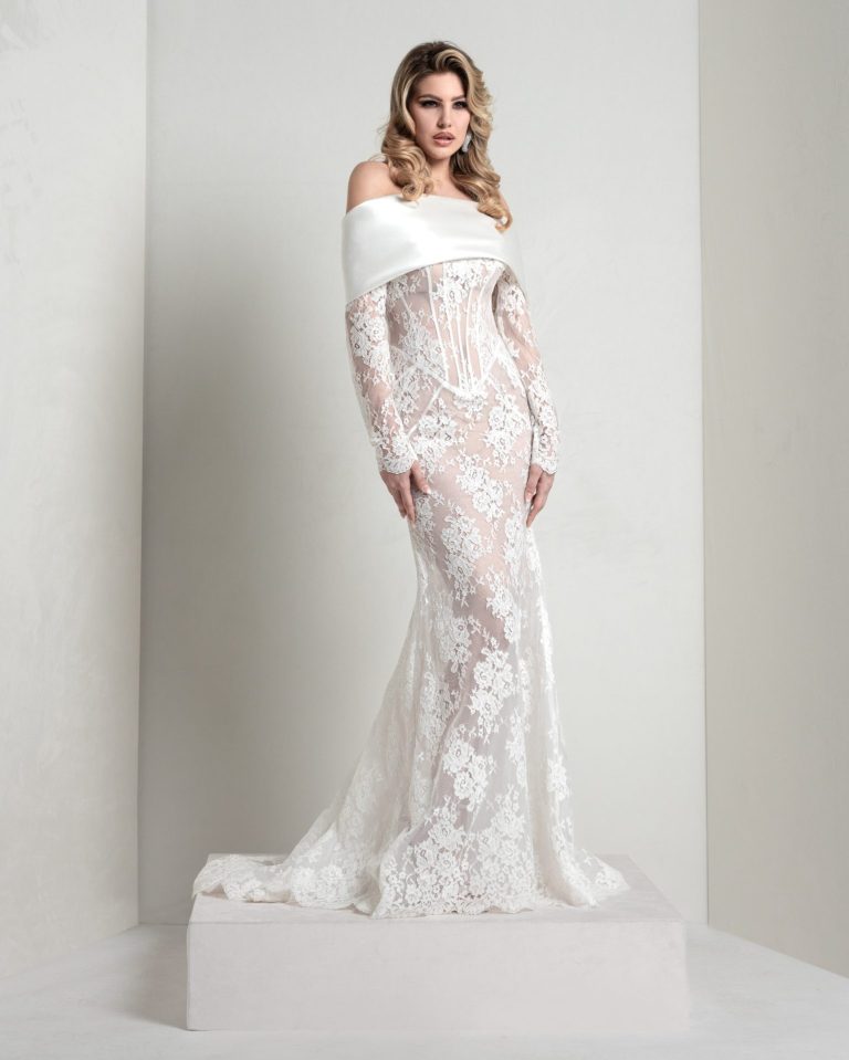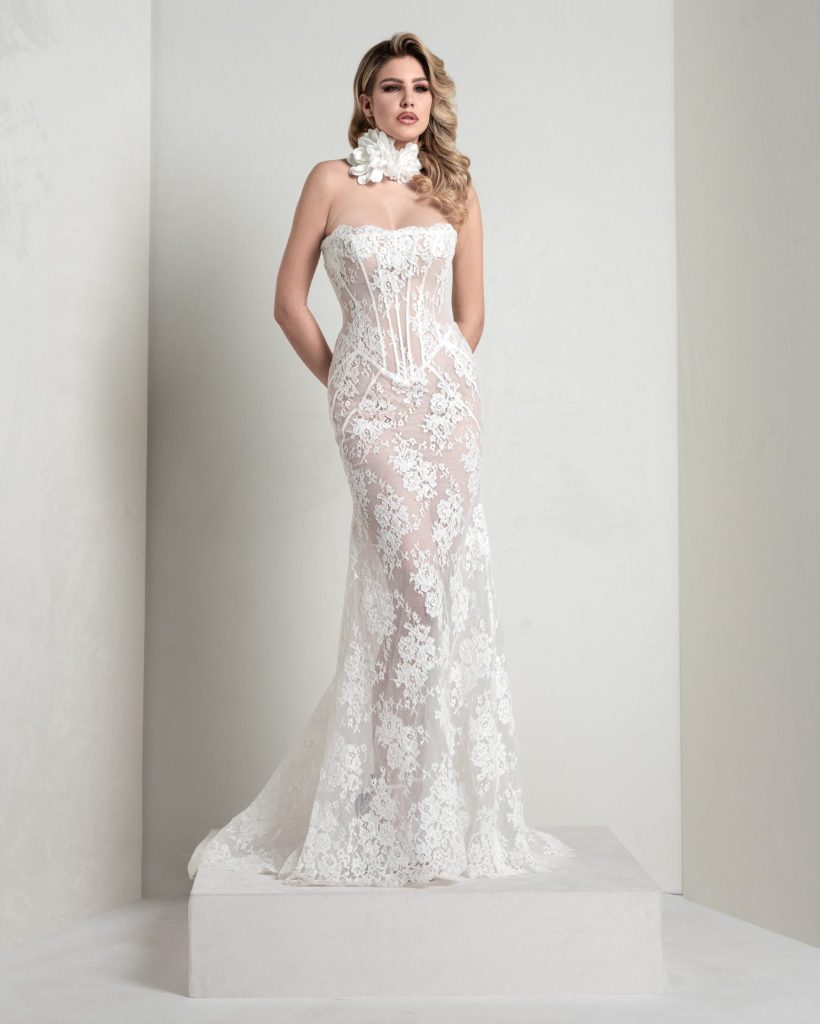 Chantilly lace mermaid dress with pointed, boned bodice and sunburst-cut skirt. The pure silk organza lapel pad enriches the look with structured elegance.