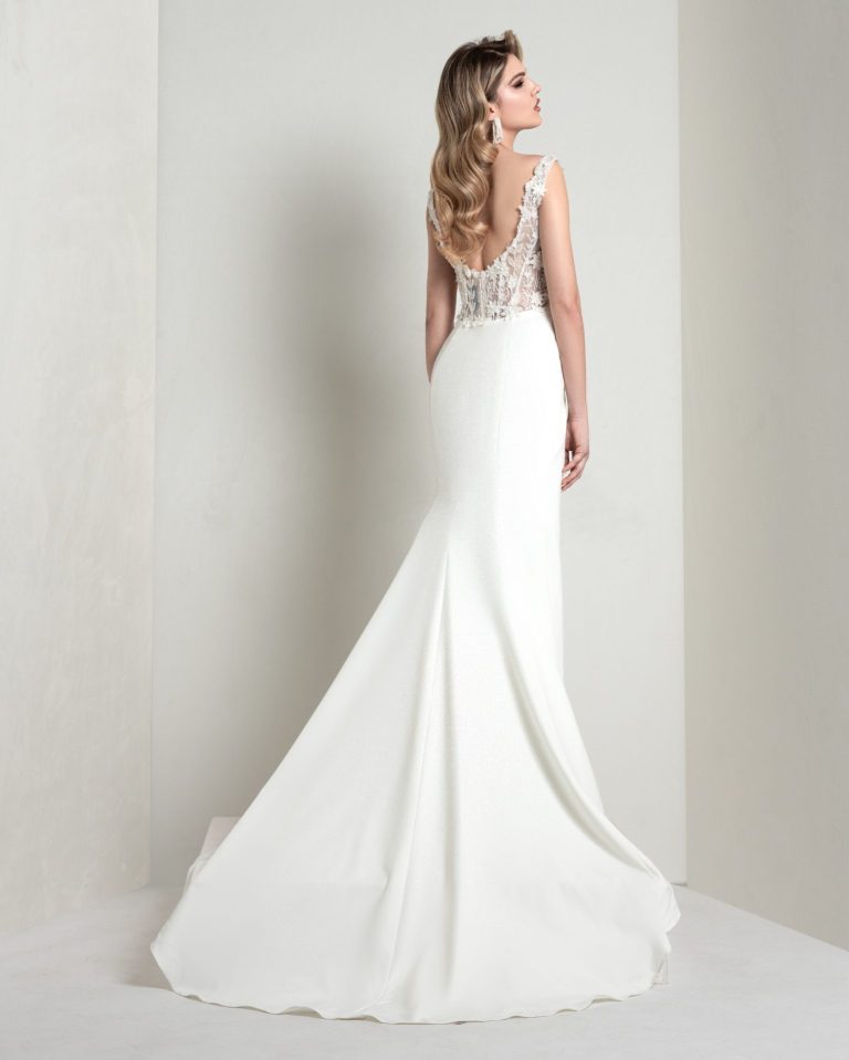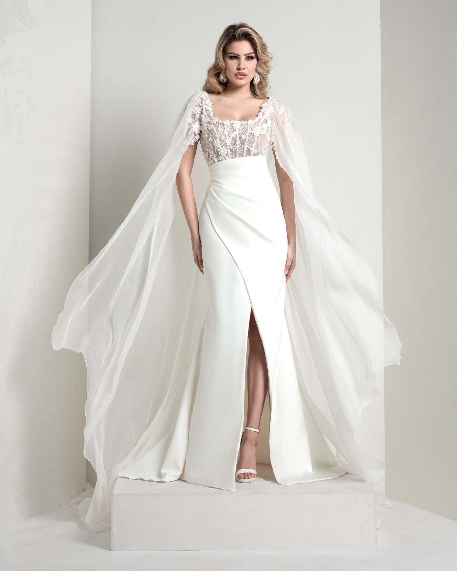 Crepe mermaid dress with 3D embroidered bodice and draped slit. An optional silk crepon cape completes the look, adding a touch of drama and refined elegance to the silhouette.