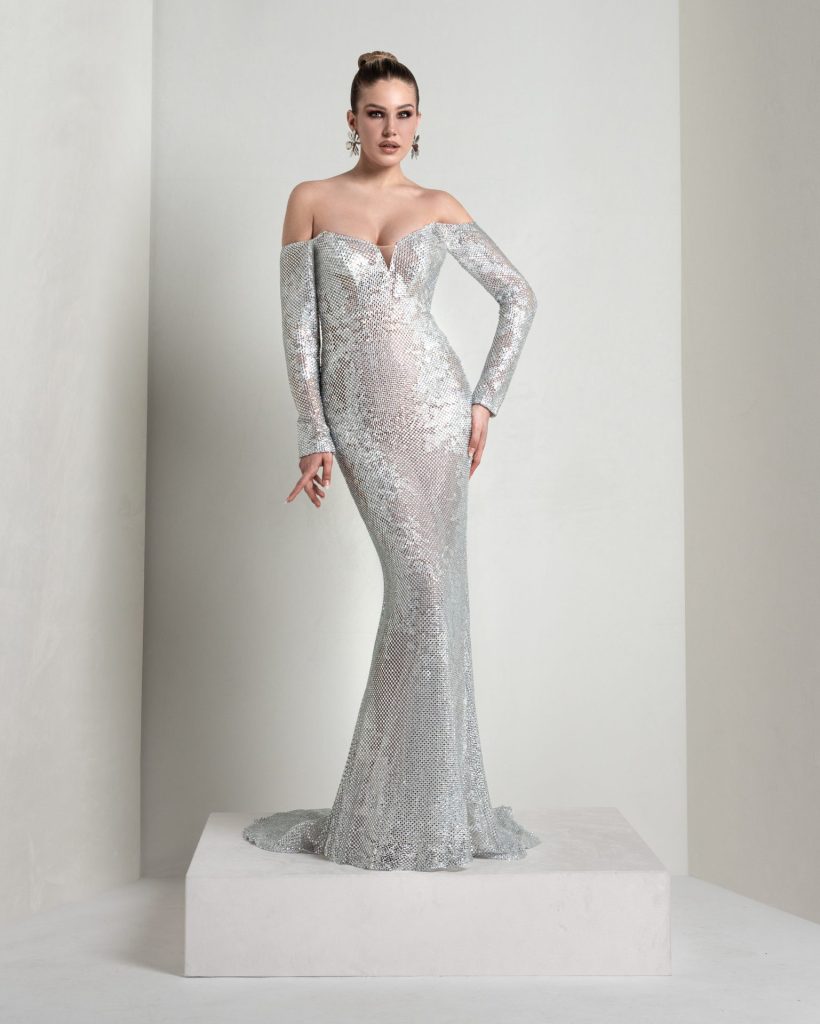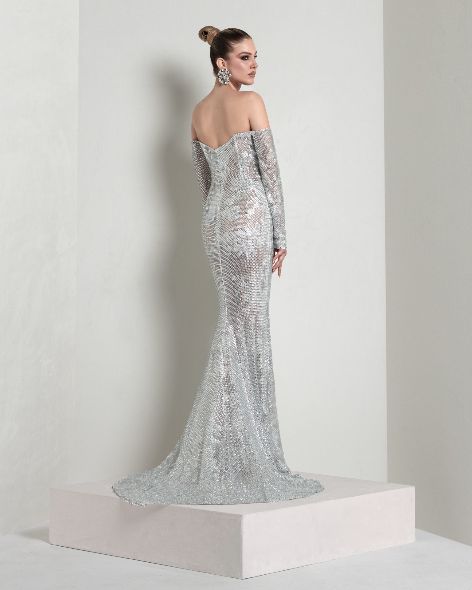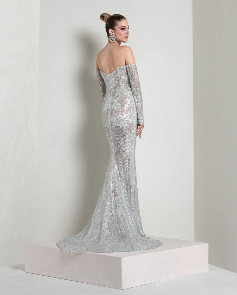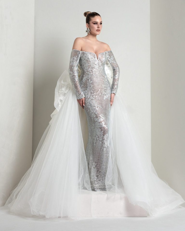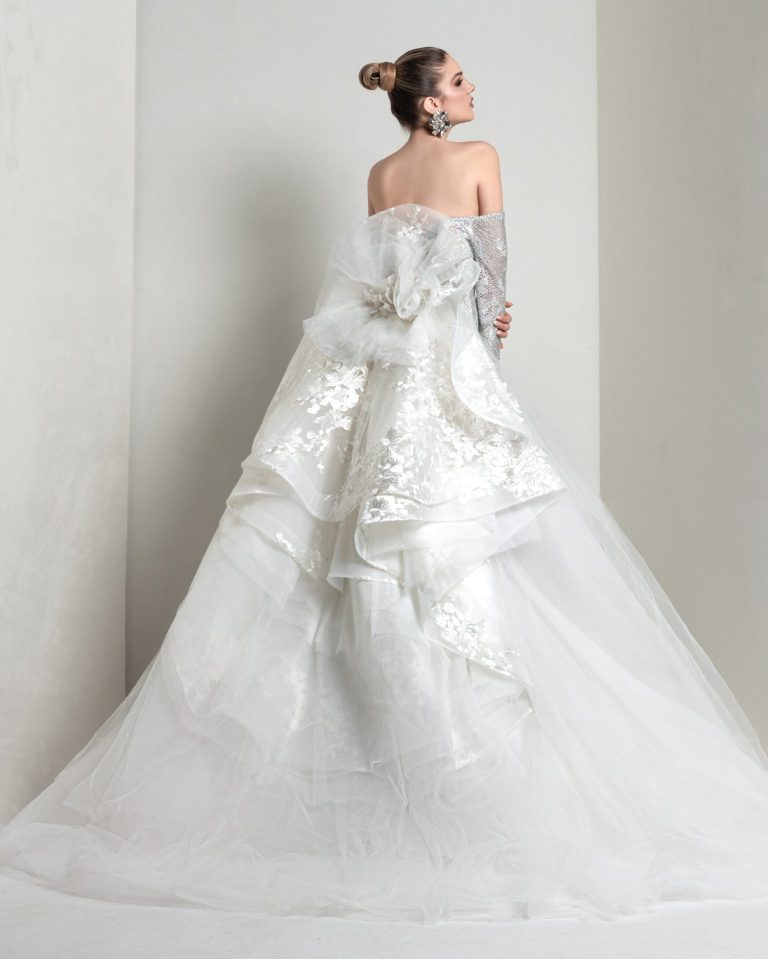 Mermaid dress in lace and Swarovski crystals. The fabrics reflect a perfect balance between romance and modern flair. The detachable train—rich in tulle and lace ruffles—adds a sculptural touch with striking visual appeal.