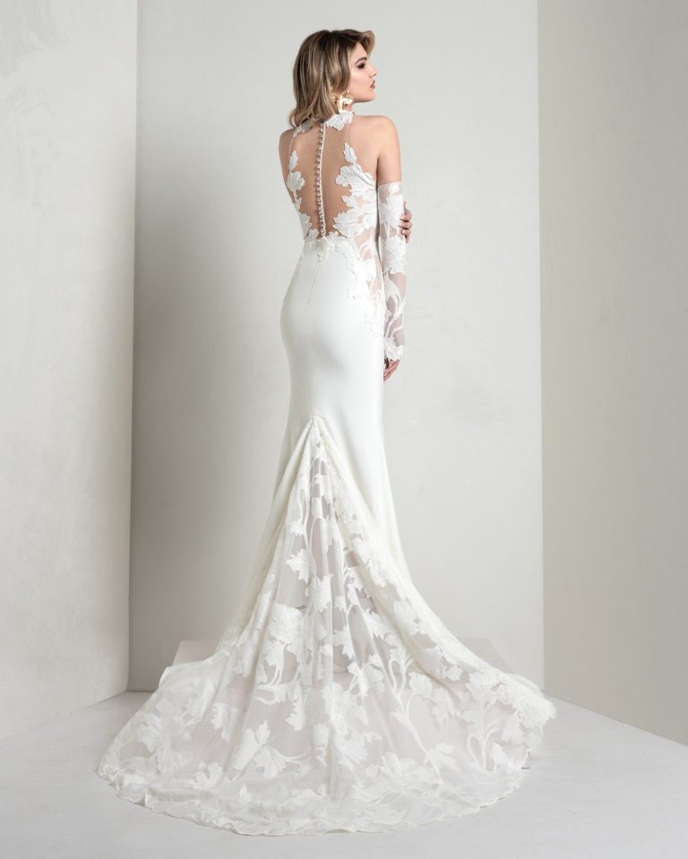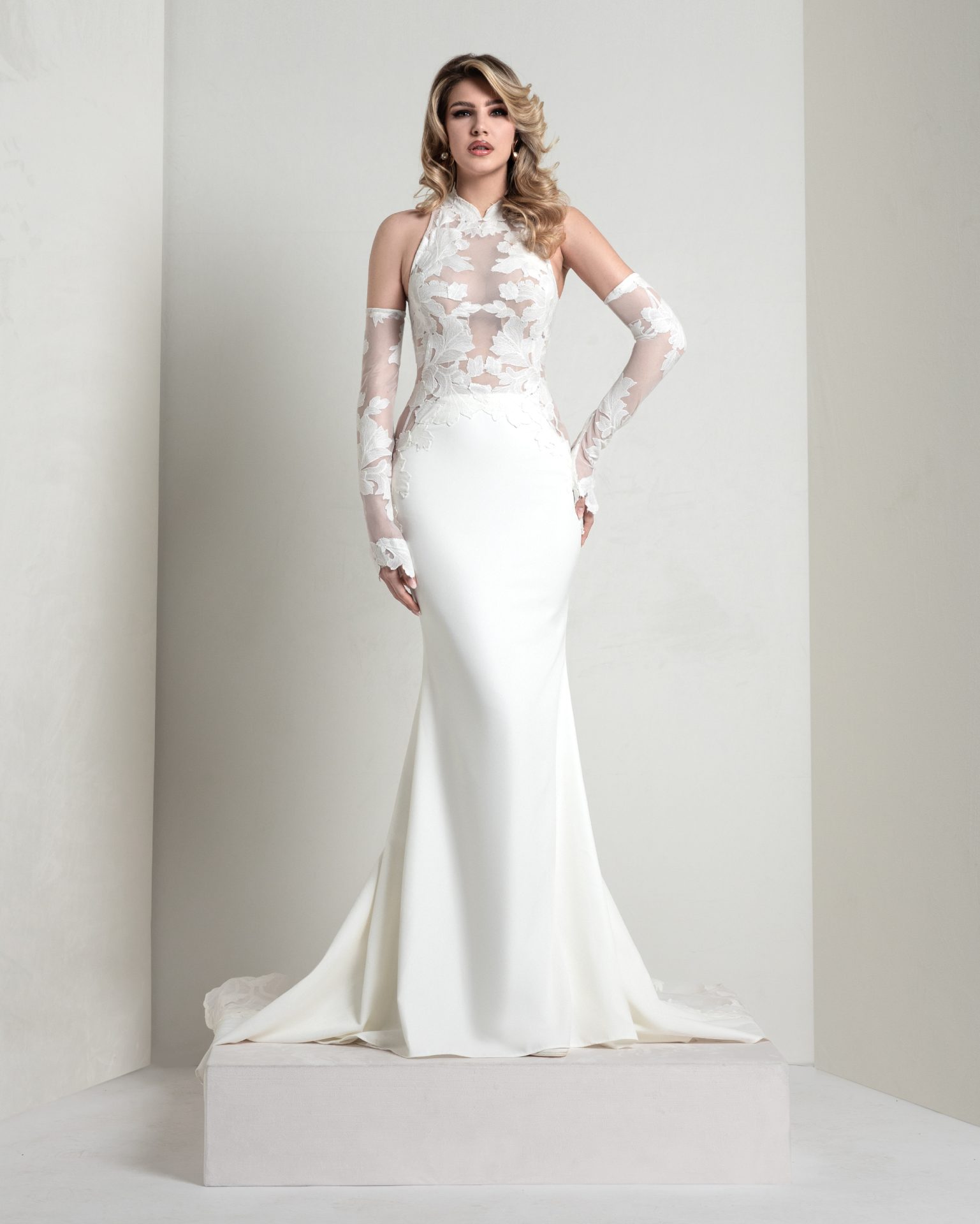 Minimalist crêpe mermaid dress, enhanced with dévoré tulle details on the bodice and train. Perfect for brides seeking understated elegance with a hint of artisanal craftsmanship.