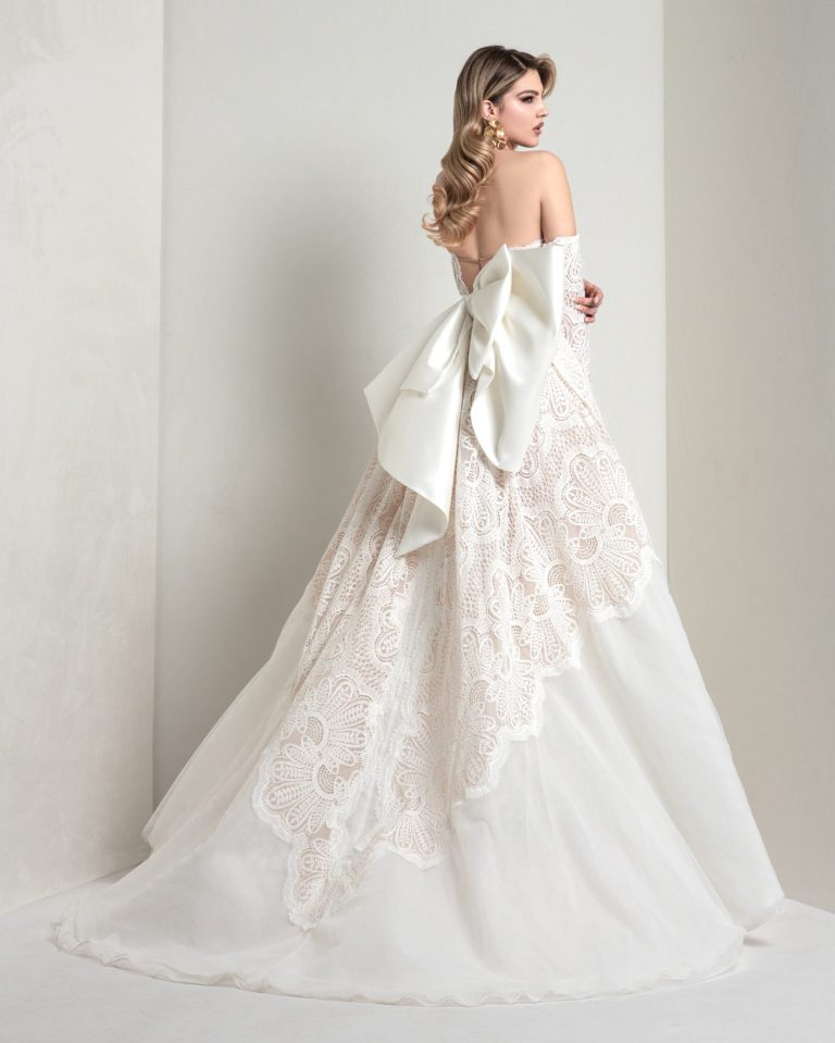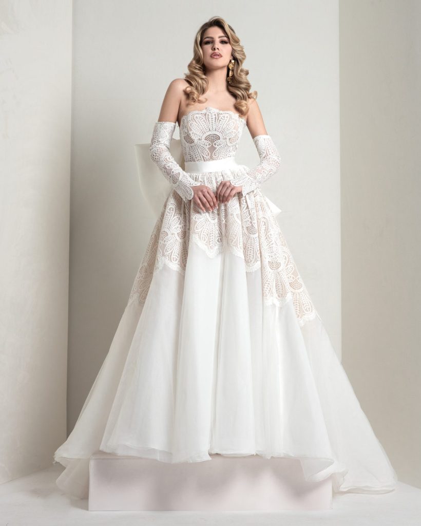 Organza with central inlay in rebrodé lace with shell pattern, inspired by the sartorial decorative tradition. An A-line silhouette with timeless elegance and exceptional artistic value.