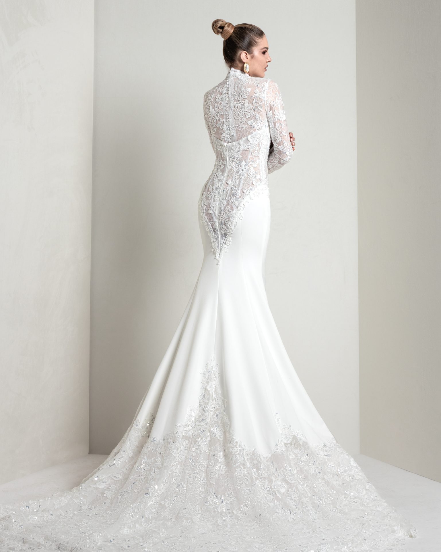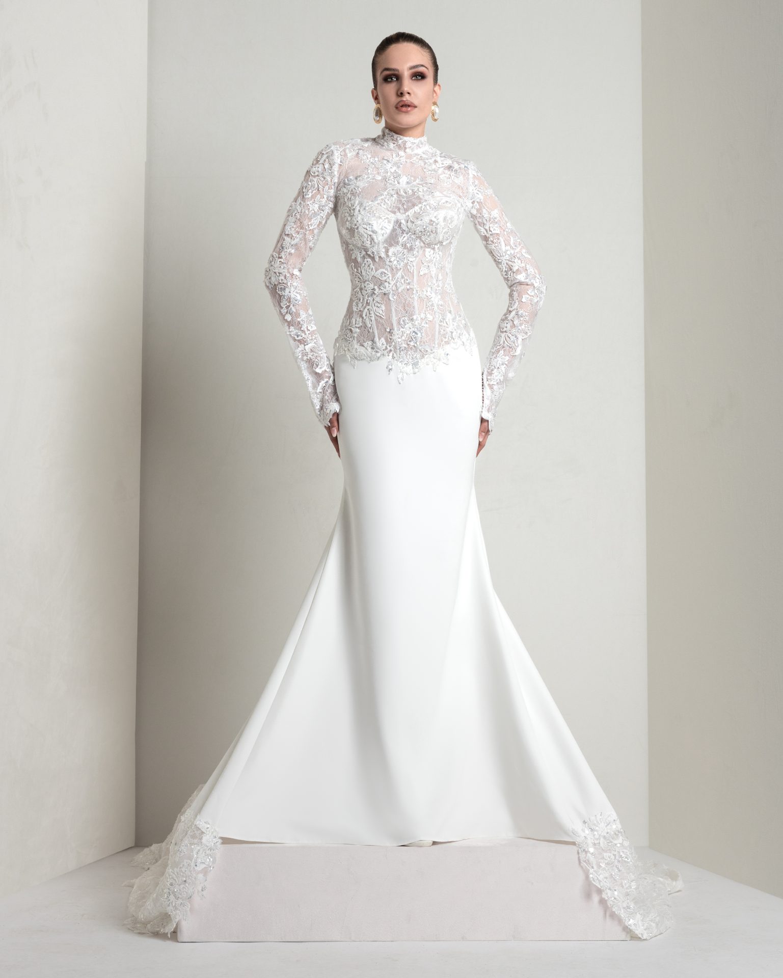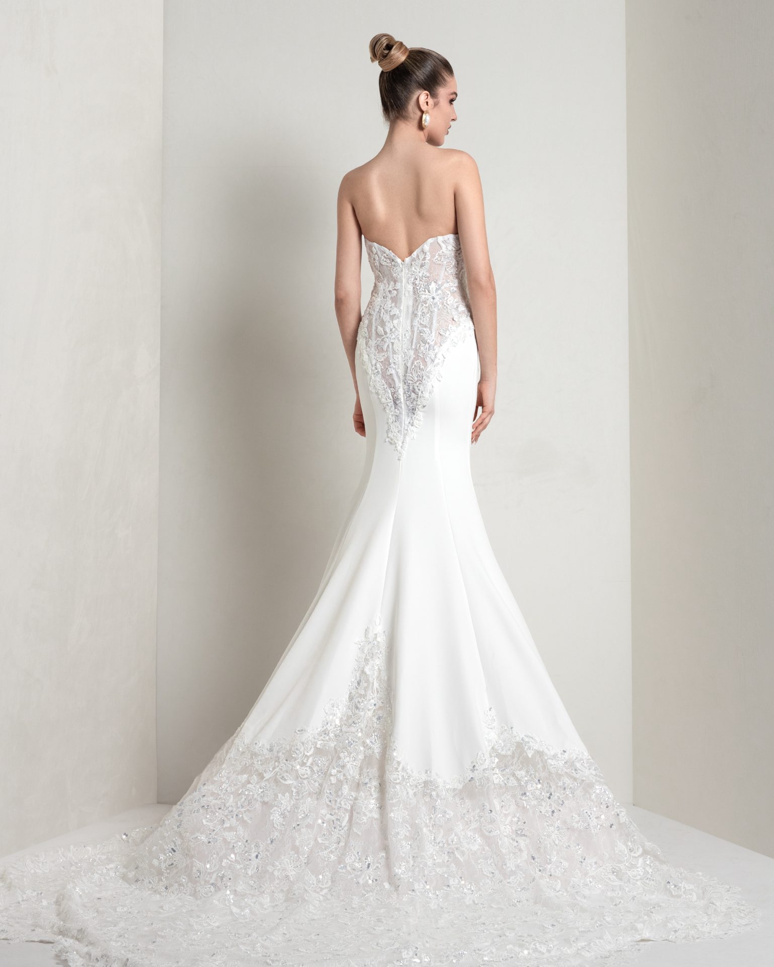 Sirena in crêpe con corpino steccato e coda in pizzo chantilly ricamato in 3D con pietre dure e micro Swarovski. Il coprispalle staccabile aggiunge un’opzione dual dress elegante, ma sofisticata.
